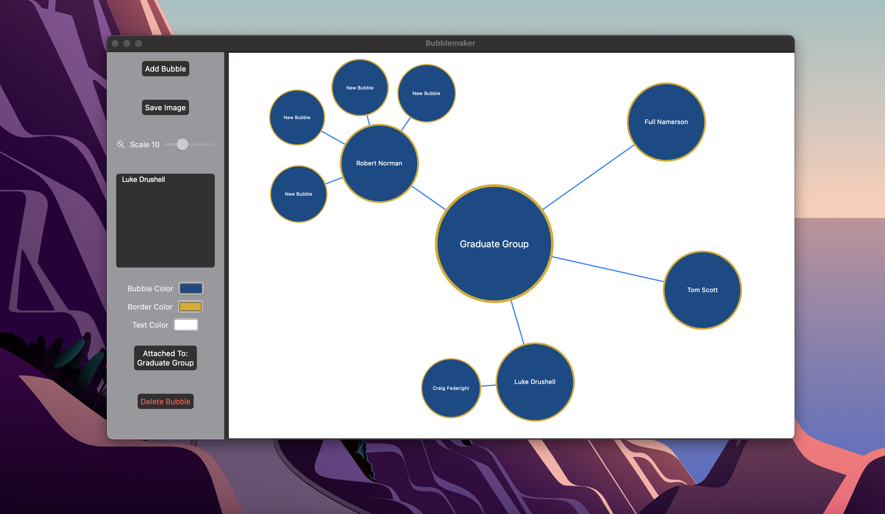 Every year the Graduate Group of Immunology at UC Davis has a bubble-spread in their catalog to show which students are working with which faculty. I designed this tool to simplify the previously painstakingly long Photoshop process which I had been taking on for a couple years. Now making bubble-spread images is a breeze!